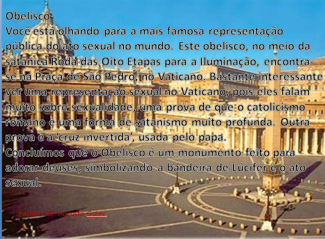 Você está olhando para a mais famosa representação pública do ato sexual no mundo. Este obelisco, no meio da satânica Roda de oito etapas para a iluminação, encontra-se na praça de São Pedro, no Vaticano. Bastante interessante ver uma representação sexual no Vaticano, pois eles falam muito sobre sexualidade, uma prova de que o catolicismo romano é uma forma de satanismo muito profunda. Outra prova é a cruz invertida, usada pelo papa. Concluímos que o obelisco é um monumento para adorar deuses, simbolizando a banheira de lúcifer e o ato sexual.
